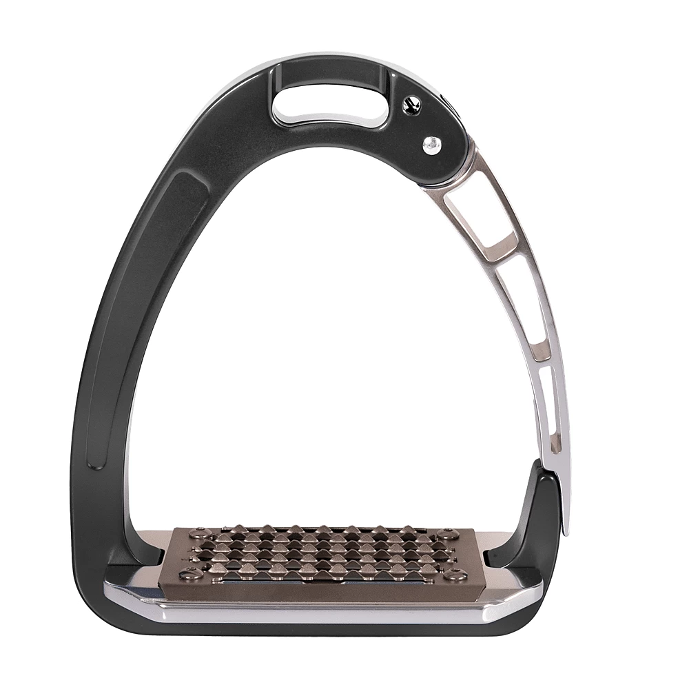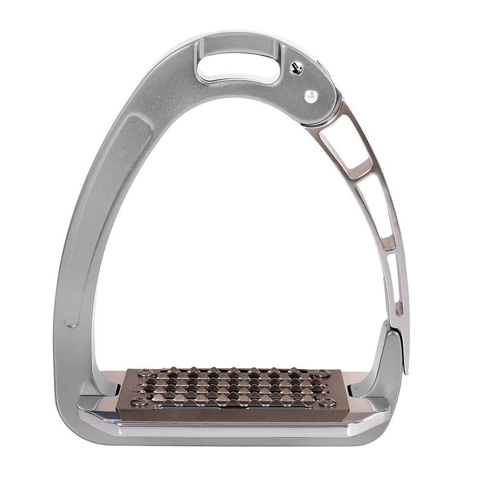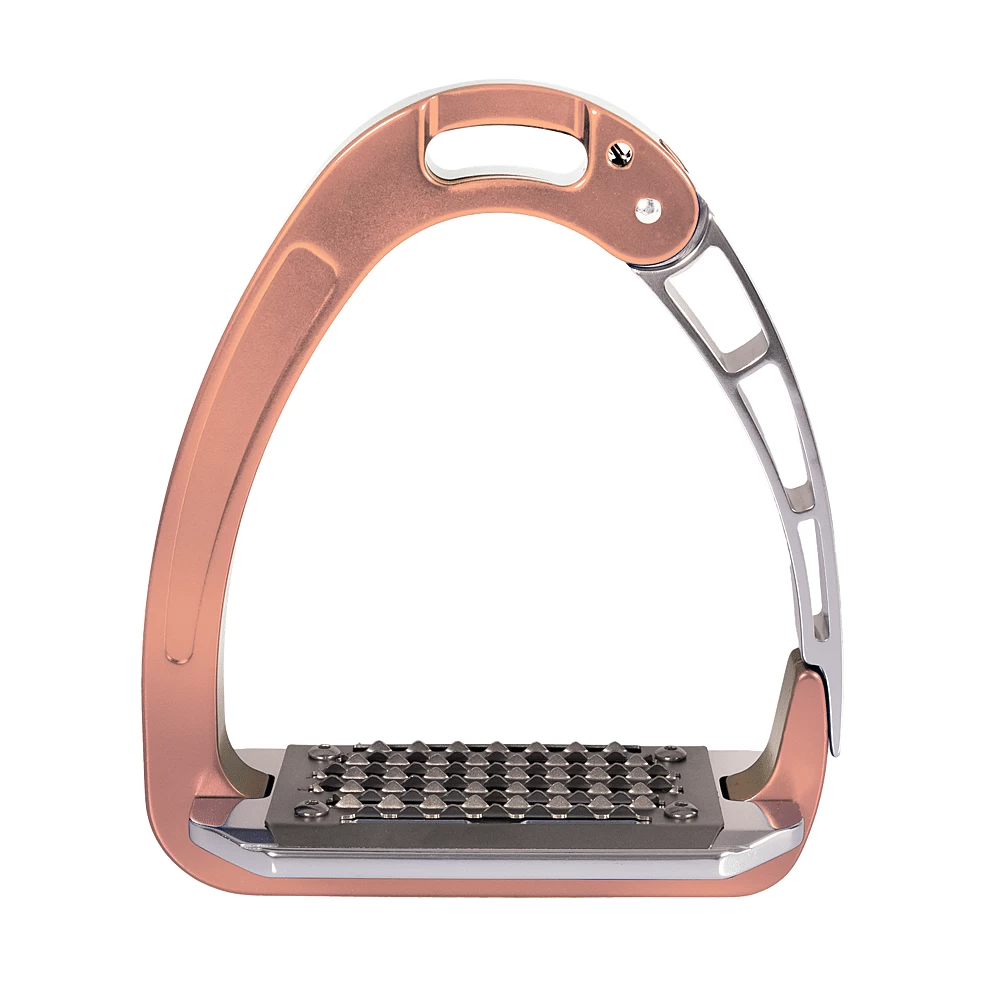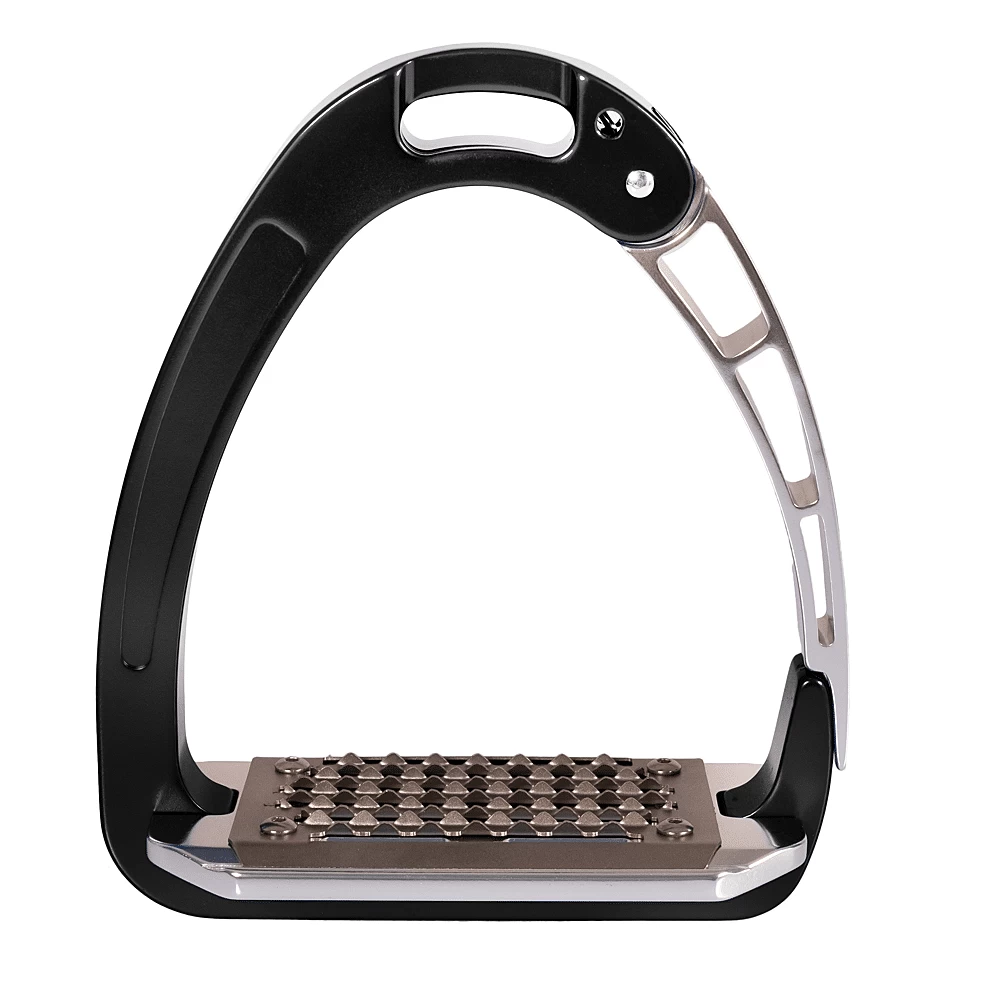 Nieuw premium model van onze gepatenteerde zijwaarts openende Arena-stijgbeugels, volledig gemaakt van gecertificeerd hoogwaardig geanodiseerd aluminium en voorzien van een roestvrijstalen loopvlak. Acavallo heeft de gebruikte materialen zorgvuldig gekozen en gecombineerd, na gedetailleerd onderzoek en uitgebreide testen. Het aluminium geeft de stijgbeugel niet alleen een strak en elegant uiterlijk, maar is ook lichtgewicht en extreem duurzaam, terwijl het roestvrij staal het loopvlak beschermt tegen corrosie, waardoor ook een lange levensduur van het product wordt gegarandeerd. De opening van het door spanning geactiveerde vergrendelings- en ontgrendelingsmechanisme bevindt zich een centimeter hoger van het loopvlak om ervoor te zorgen dat de voet niet per ongeluk zijdelings naar buiten kan glijden en om te voorkomen dat zand en vuil de openingsactie van de arm vertragen in geval van nood. Lange gaten in het loopvlak voorkomen ophoping van zand en vuil, zodat het grijpende effect niet wordt aangetast en een helling van vijf graden van het loopvlak helpt ruiters om de juiste houding aan te nemen, waardoor de spanning in hun enkels, kuiten, knieën en heupen wordt verminderd.