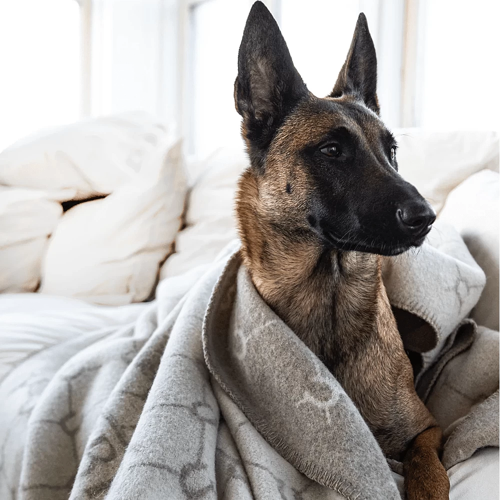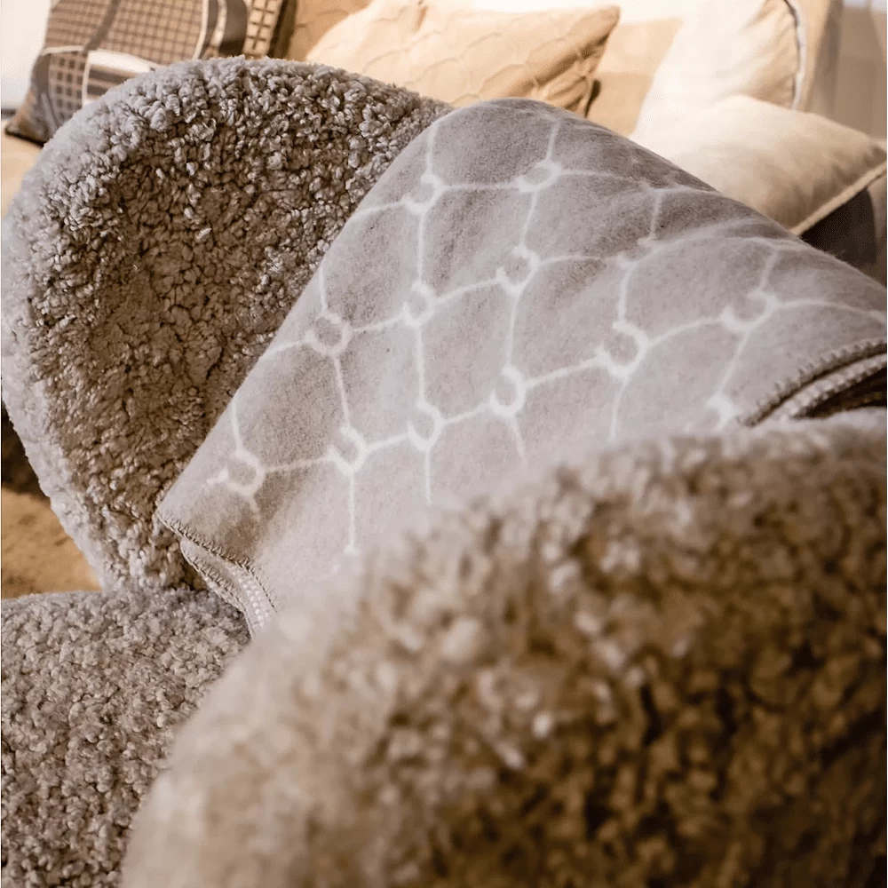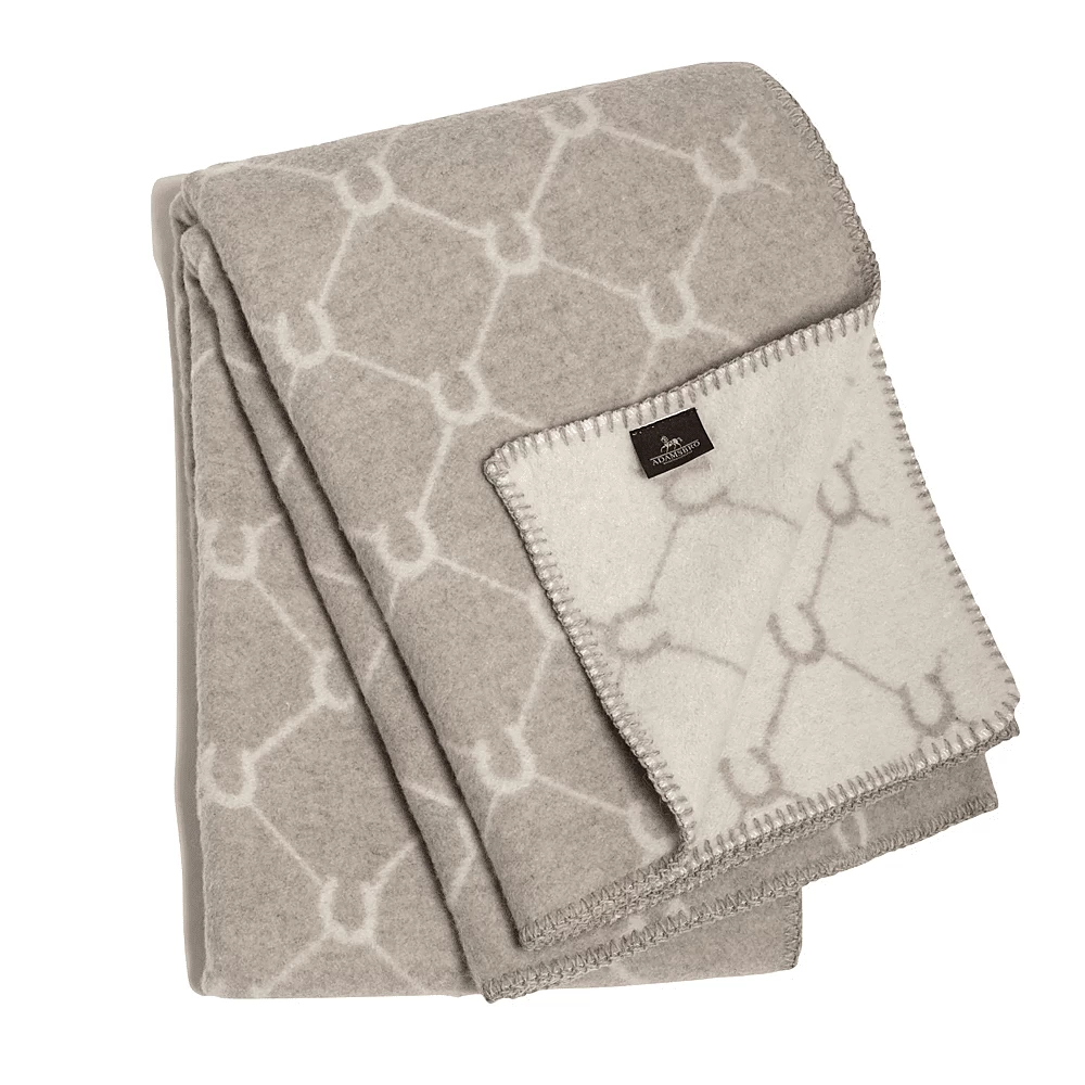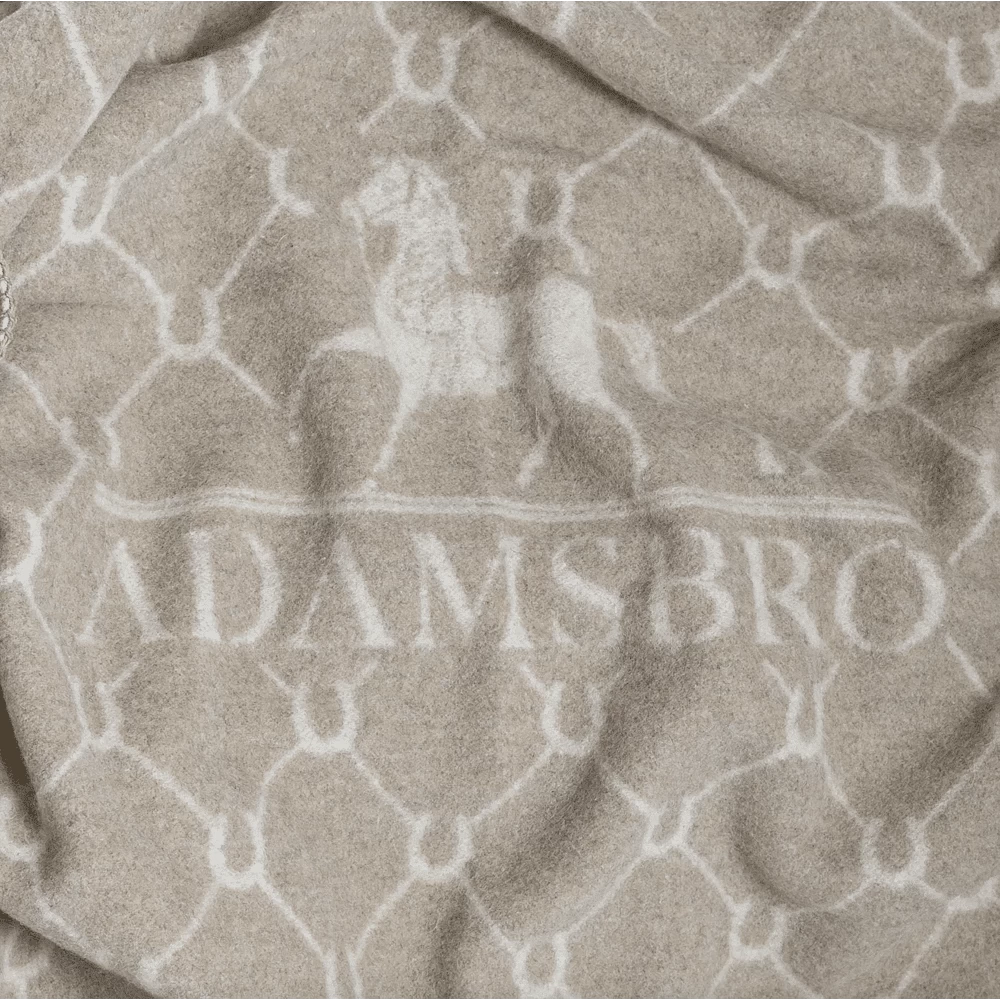 Luxe plaid van merinowol. Voorkant in gemêleerd beige met Adamsbro-logo en paardenhoefpatroon in beige. Terug in gebroken wit. Veterranden.