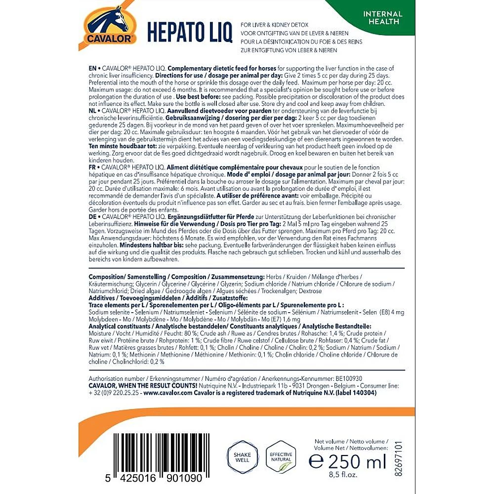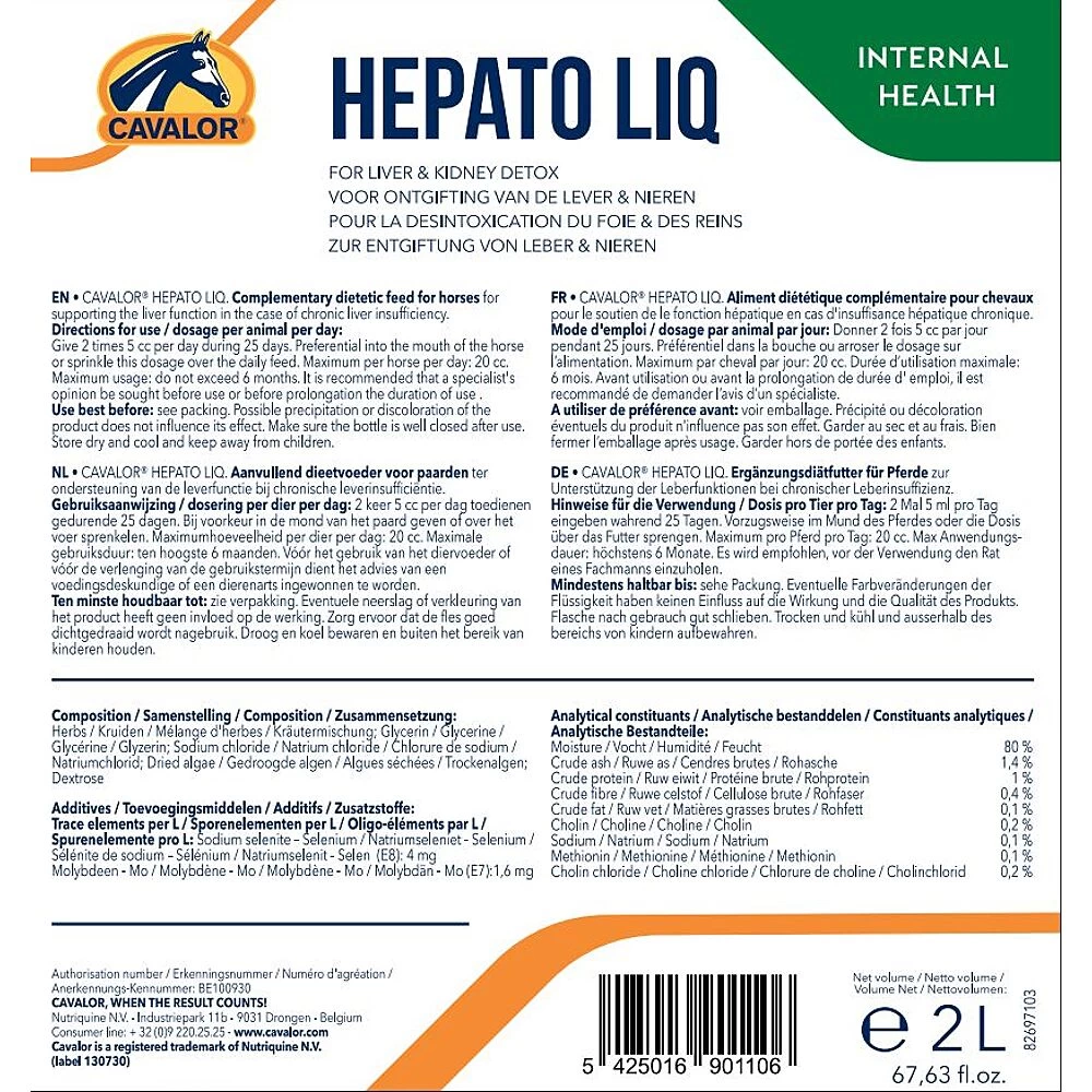 Vooral tijdens het wedstrijdseizoen krijgt je paard heel wat te verwerken. Wanneer het hard traint en presteert, produceert zijn lichaam veel afvalstoffen. Door de lever en nieren te ondersteunen en zo het afbraakproces een handje te helpen, kan je paard die stoffen beter verwerken. Met een kuur Cavalor Hepato Liq zuiver je de organen die de motor zijn achter dat hele proces en stimuleer je hun werking. Het is als het ware een echte detox. Je paard recupereert zo van een lang wedstrijdseizoen en je bereidt het ook nog eens voor op het komende seizoen. Hepato Liq zit boordevol kruidenextracten die een weldadige werking hebben op de lever en de nieren.