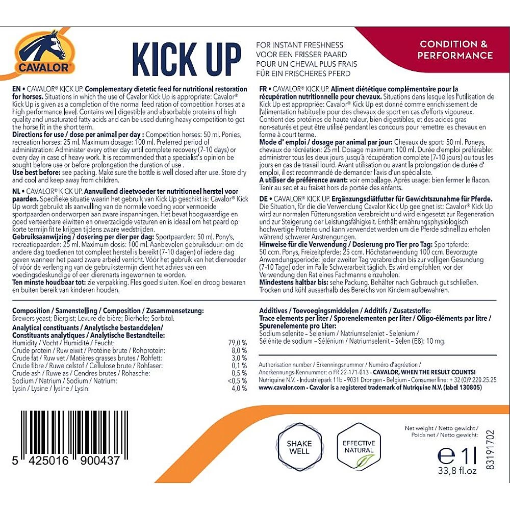 Cavalor Kick Up is een vloeibaar supplement dat het rantsoen verrijkt met gemakkelijk en snel opneembare vitaminen, mineralen, aminozuren en aromatische plantenextracten.