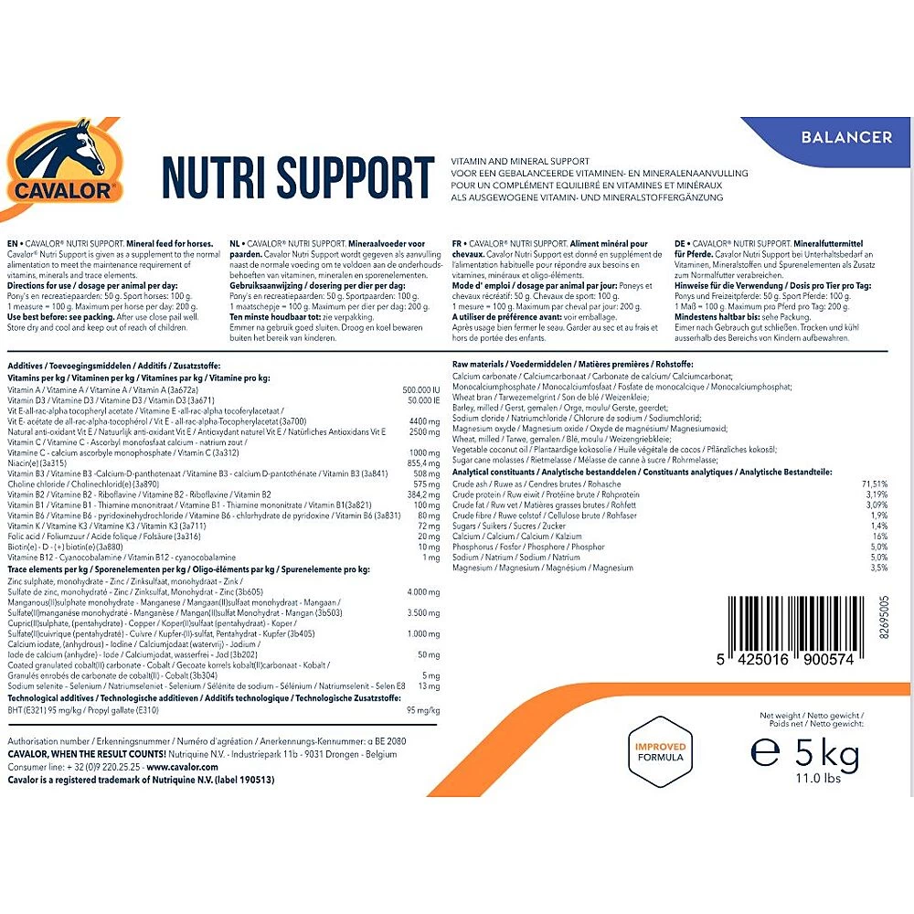 Cavalor Nutri Support bevat alle voedingsstoffen die het recreatiepaard nodig heeft om te blaken van gezondheid. Nutri Support werd zo geformuleerd dat het de ideale aanvulling vormt voor een rantsoen dat enkel/vooral uit ruwvoer bestaat en weinig krachtvoeder bevat. Deze mix bevat geen extra energie en eiwit, waardoor de paarden en pony’s er niet heet of dik van worden.