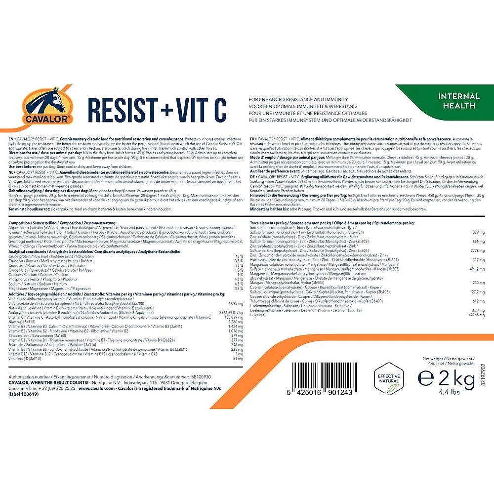 In emmer (poedervorm), Cavalor® Resist + Vit C 2kg, hoeveelheid voor 45 dagen.