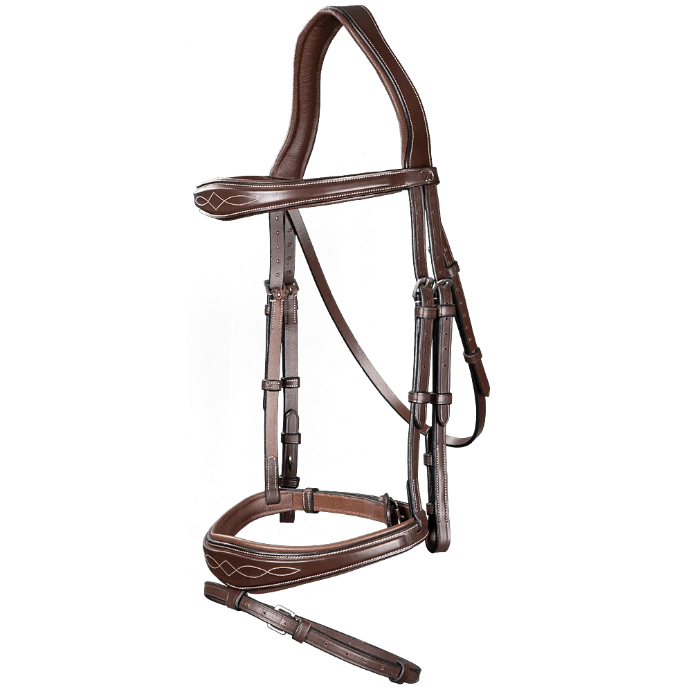 • Frontriem en neusriem zijn verbreed in het midden en onderlegd, met decoratieve stiksels