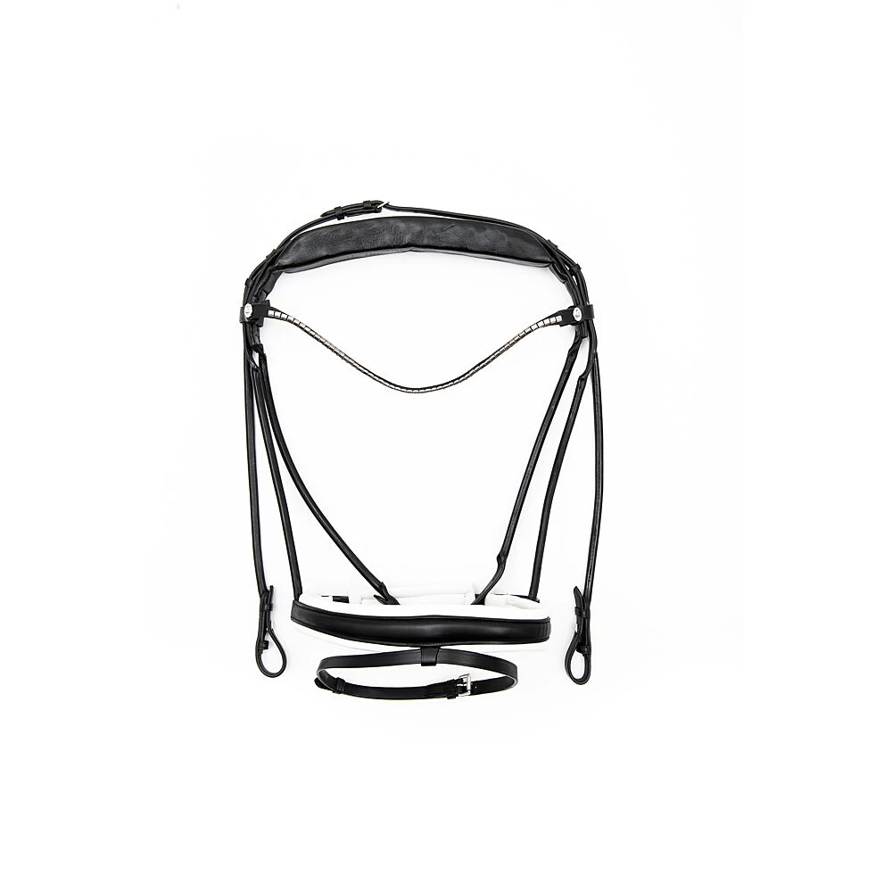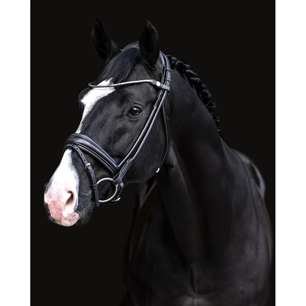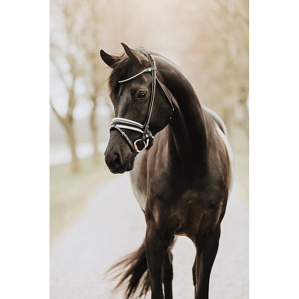 Het kopstuk van dit Trenshoofdstel Cassidy is volledig uniek en is ontworpen om de druk op de nek van je paard te verdelen en te verminderen. Het hoofdstel is rondgenaaid en heeft zilveren gespen. Hoofdstel model Cassidy van Finesse Bridles is rondgenaaid en heeft een brede neusriem. Het is tijdloos en zeer elegant ontworpen. De neusriem sluit met een pullback functie. Het kussentje op de neusriem beschermt de onderkaak. De neusriem kan eenvoudig worden verwijderd of verwisseld vanaf de zijkant van het nekstuk. Elk paard en elke ruiter kan het hoofdstel op alle niveaus gebruiken. Veel dressuurruiters geven de voorkeur aan de brede neusriem en ronde stiksels.