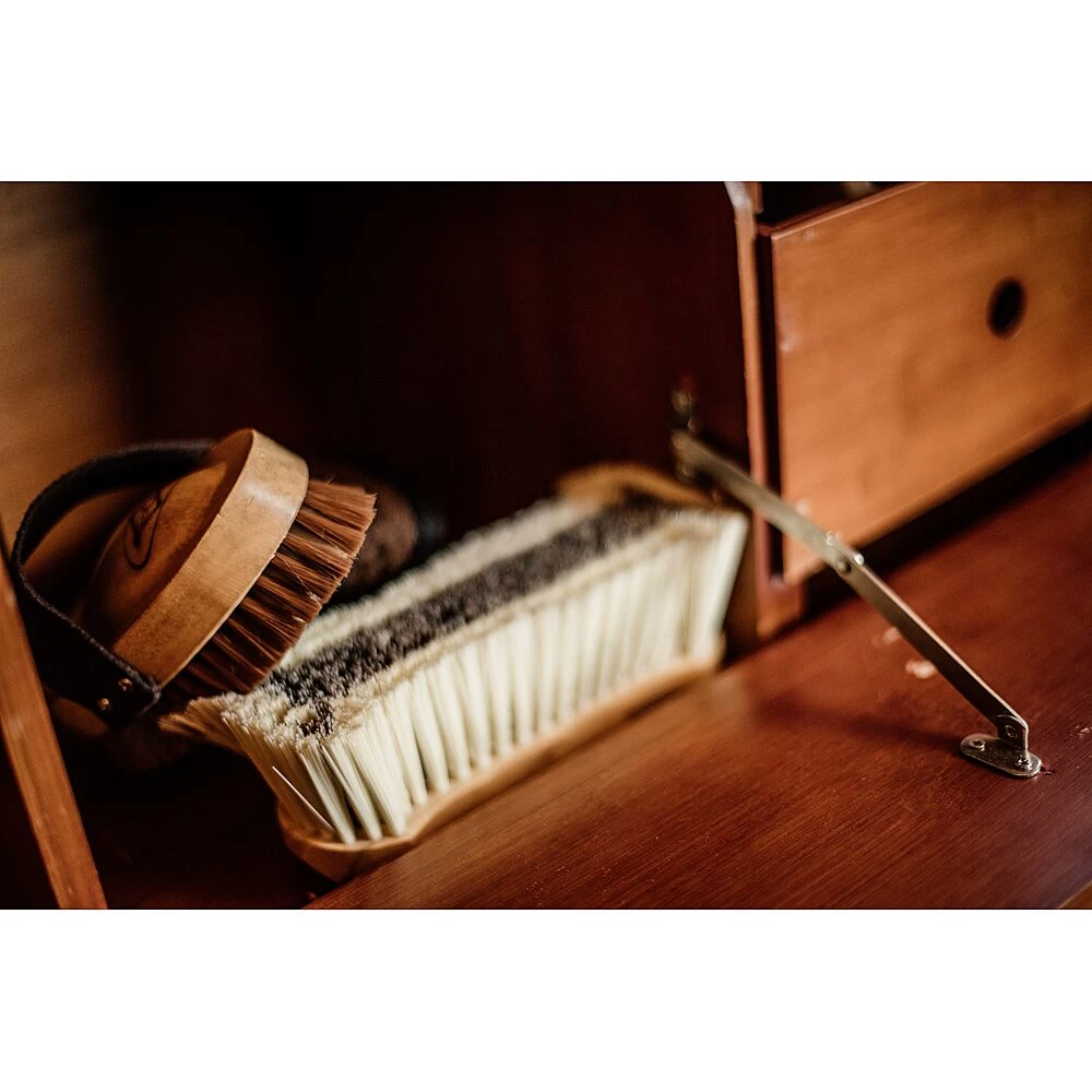 Deze Show Grooming Box wordt uw beste bondgenoot om al uw verzorgingsproducten in op te bergen op wedstrijd of thuis. Hij is 43,5cm hoog, 59,5cm breed en 32cm diep. De Box opent met twee deuren en kan gesloten worden met een gouden kliksluiting waarop je een slot kan plaatsen. Binnenin vindt u 2 kleine laden (9,5×27,5x20cm), een grotere lade (14×27,5×28,5cm), een groot vlak (28,5x28x29cm) en een kleiner vlak (8x28x28cm). Men kan de bodem en laden verwijderen. Ideaal voor als u meer ruimte nodig hebt bij het schoonmaken of bij het nemen van uw product. Het is gemaakt van bamboe waardoor het extra stevig en gemakkelijk schoon te maken is. Het wordt geleverd met 3 gouden handgrepen zodat men het gemakkelijk kan dragen. Combineer stijl en organisatie voor al uw producten met deze prachtige Grooming Box.
