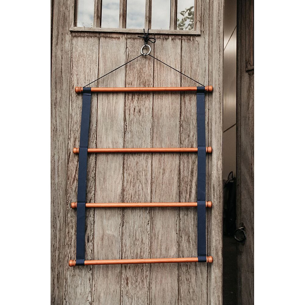 Met dit Grooming Deluxe luxe dekenrek kan je jouw zadeldoeken bewaren in je zadelkamer en ventilatie garanderen. Een essentiële accessoire op stal of op wedstrijd. Het dekenrek is gemaakt van bamboe met marineblauwe details voor een chique uitstraling die bij de rest van onze stalproducten past. Er kunnen vier zadeldoeken aan het rek hangen. Verde is het dekenrek voorzien van een ring en touw om het op te hangen waar je maar wilt.