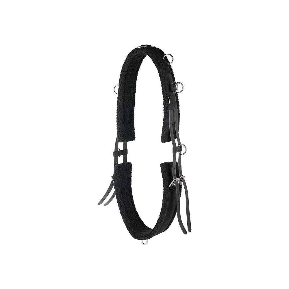 Longeersingel met bont/fleece voering. Zilverkleurige fournituren en kunstlederen stoten. Aan beide zijden te verstellen d.m.v. gespen. De longeersingel is voorzien van 11 ringen waarvan 1 ring aan de onderkant. Verstelbaarheid van de maten: Cob: omvang van 147 tot 203cm Full : omvang van 173 tot 230cm