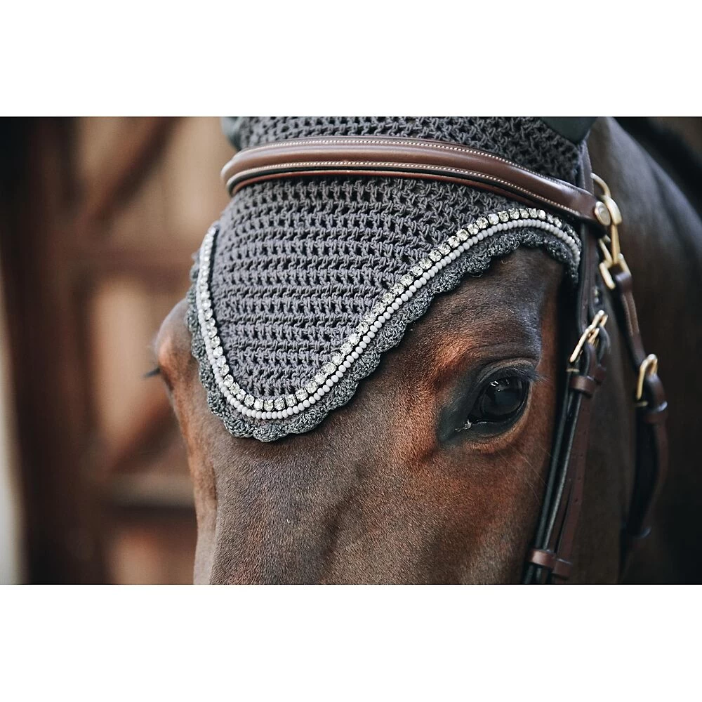 Naast onze andere populaire oornetjes hebben we een nieuw model ontworpen. De langwerpige vorm biedt de mogelijkheid het oornetje vast te maken aan de neusriem. Dit oornetje is afgewerkt met steentjes en parels in dezelfde kleur als het oornetje zelf. De buitenrand glinstert. Het Oornetje lang stone & pearl is een fantastische match met onze Zadeldoek met parels. Deze outfit zal hoofden draaien! Het oornetje beschermt ook de oren van je paard tegen de vliegen tijdens het rijden. Het oornetje wordt volledig met de hand gemaakt. Het materiaal rond de oren is rekbaar en sluit mooi aan. Het nekgedeelte is iets langer dan bij andere oornetjes zodat het beter blijft zitten. Er werd een glinsterende touch aangebracht zodat ook de ruiter ervan kan genieten tijdens het rijden. Het Kentucky logo is niet zichtbaar waardoor, indien gewenst, een eigen logo kan aangebracht worden.