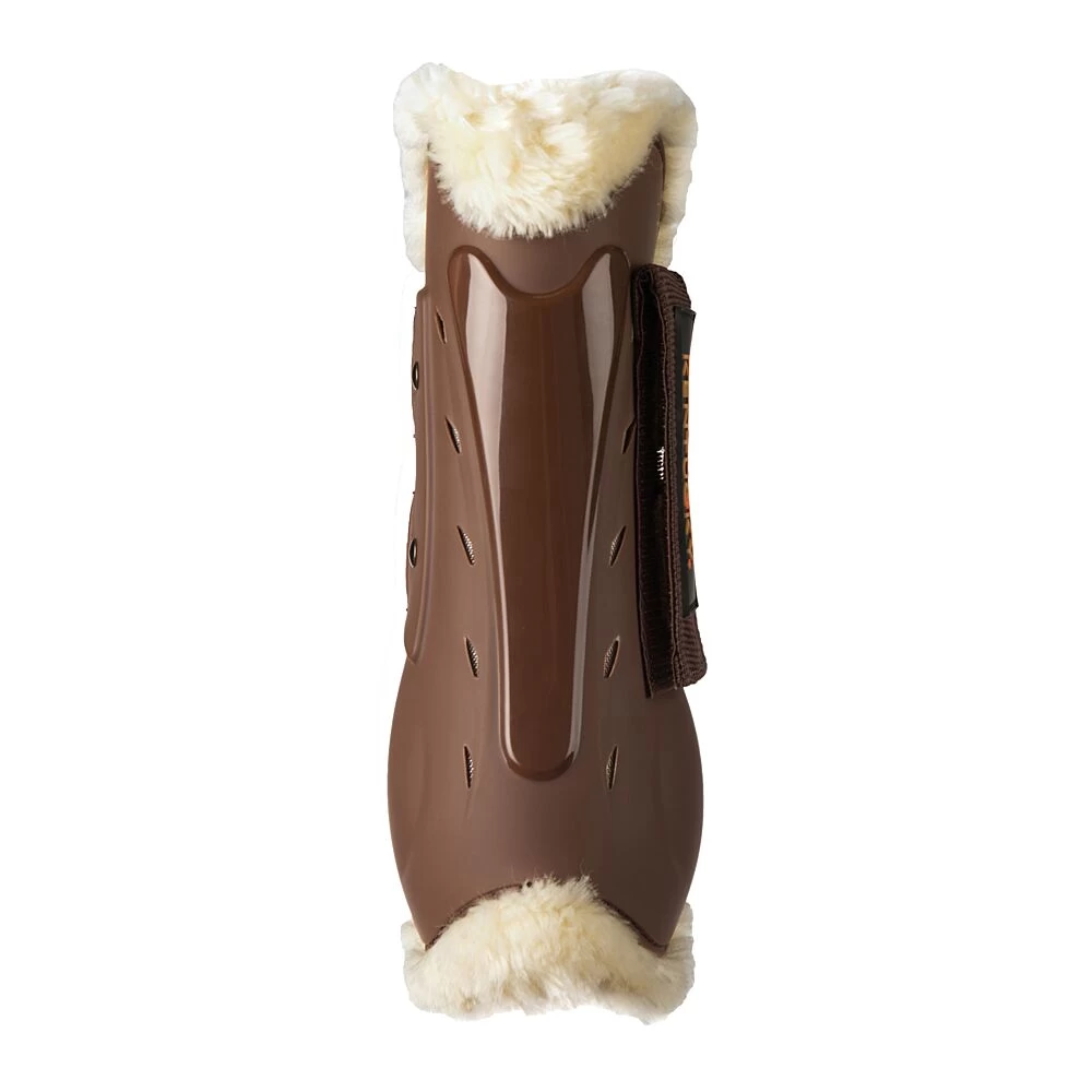 Onze artificiële wollen voering zit vast aan een gebreide basis dat zeer ademend en luchtdoorlatend is en is dan gelamineerd op een suede stof die alsook zeer ademend en luchtdoorlatend is. Dit materiaal samen met de ventilatie gaatjes zorgen ervoor dat deze peesbeschermer zeer ademend is en oververhitting van de pezen wordt voorkomen.