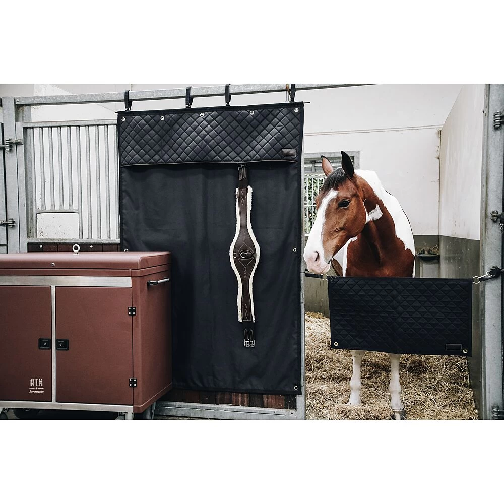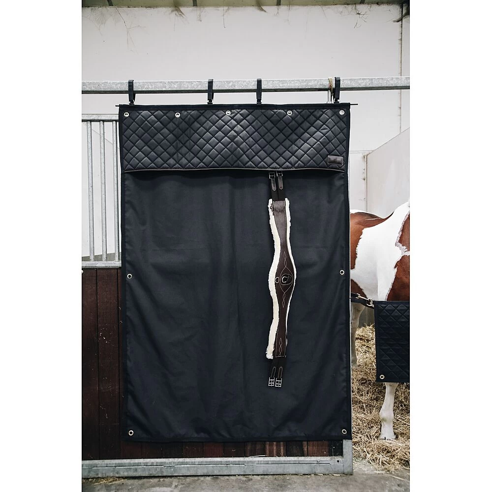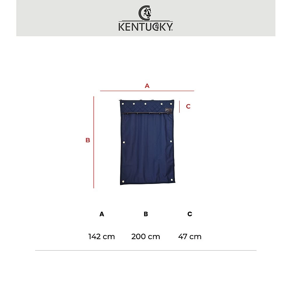 Het Kentucky waterdicht stalgordijn biedt je paard de nodige rust op een meerdaagse wedstrijd of in zijn eigen stal. Dit stalgordijn heeft vijf versterkte velcros om het gordijn te bevestigen aan de stal. Onder de bovenflap bevinden zich vijf musketon haken waaraan je benodigdheden kan bevestigen: hoofdstellen, dekenrek, poetshaak, etc. Deze musketon haken zitten mooi weggestopt achter de stijlvolle flap met Kentucky logo in artificieel leder. Het artificieel lederen biesje op de flap en het mooie Kentucky logo geven dit stalgordijn een stijlvolle look. Machine wasbaar op 30°, geen droger.