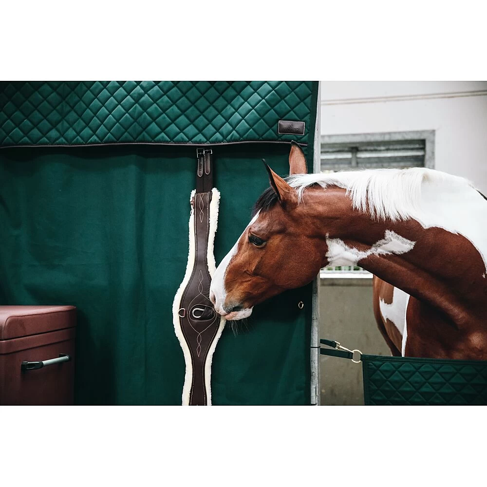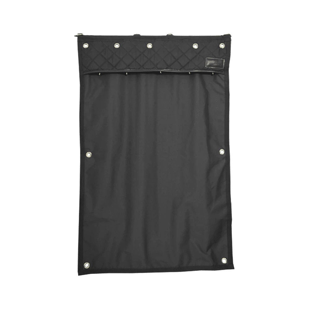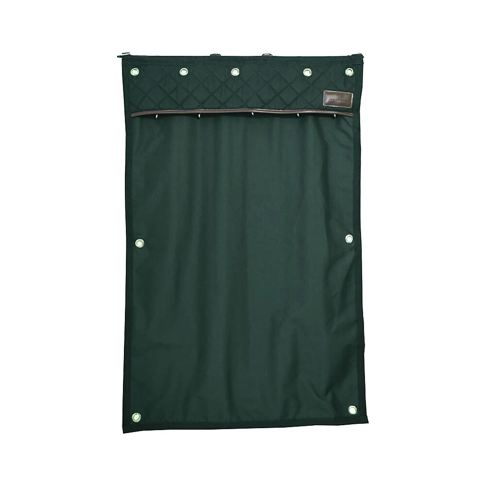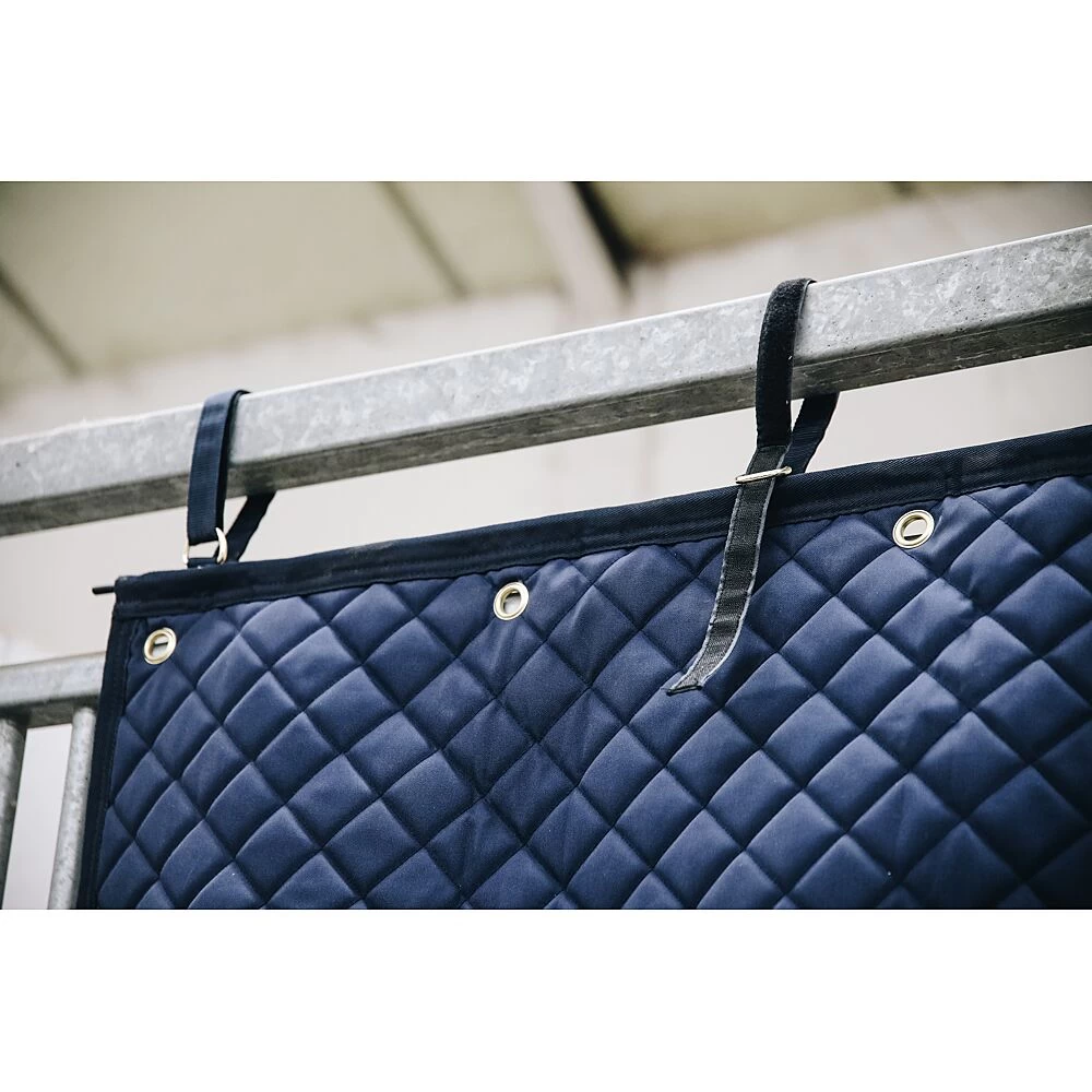 Het Kentucky waterdicht stalgordijn biedt je paard de nodige rust op een meerdaagse wedstrijd of in zijn eigen stal. Dit stalgordijn heeft vijf versterkte velcros om het gordijn te bevestigen aan de stal. Onder de bovenflap bevinden zich vijf musketon haken waaraan je benodigdheden kan bevestigen: hoofdstellen, dekenrek, poetshaak, etc. Deze musketon haken zitten mooi weggestopt achter de stijlvolle flap met Kentucky logo in artificieel leder. Het artificieel lederen biesje op de flap en het mooie Kentucky logo geven dit stalgordijn een stijlvolle look. Machine wasbaar op 30°, geen droger.