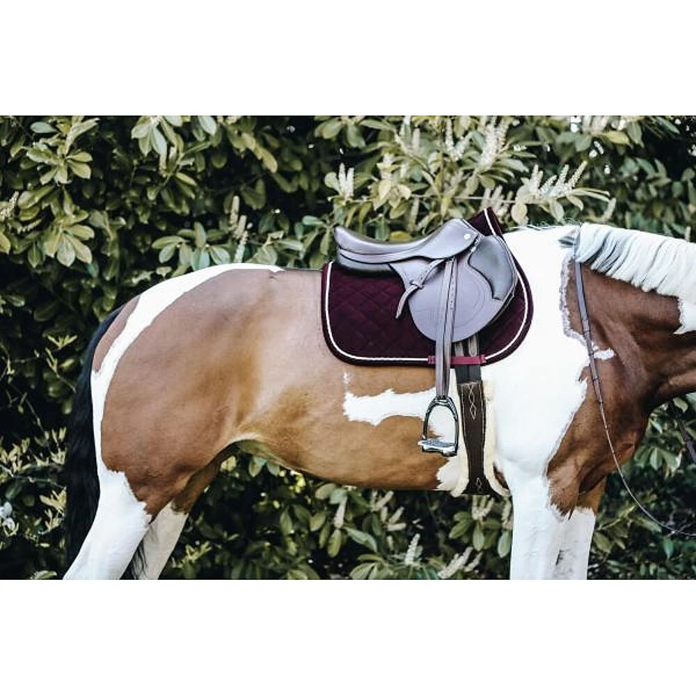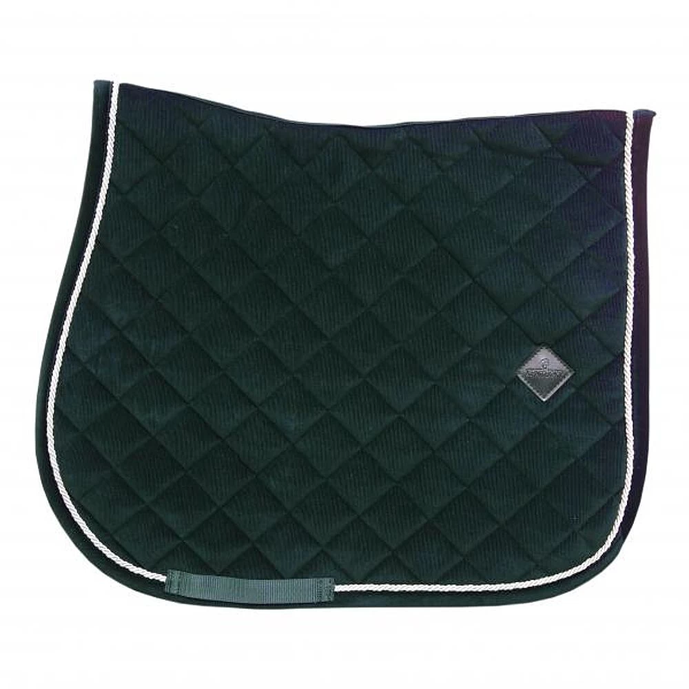 Het zadeldek Corduroy is gemaakt voor jumping en biedt een zeer aangename scheiding tussen de rug van het paard en het zadel en beschermt het paard tegen mogelijke wrijving. Dit zadeldek heeft een zeer stijlvolle look door het mooie ribfluweel materiaal in combinatie met gedraaide bies en diamanten stiksel. Deze zadeldek heeft geen vervelende bandjes om aan het zadel vast te maken, enkel een lus voor de singel. Het Kentucky logo is subtiel aangebracht in de vorm van een lederen ruitje dat nog voldoende ruimte biedt om een eigen logo te borduren. Het zadeldek is machine wasbaar op 30°, geen droger.