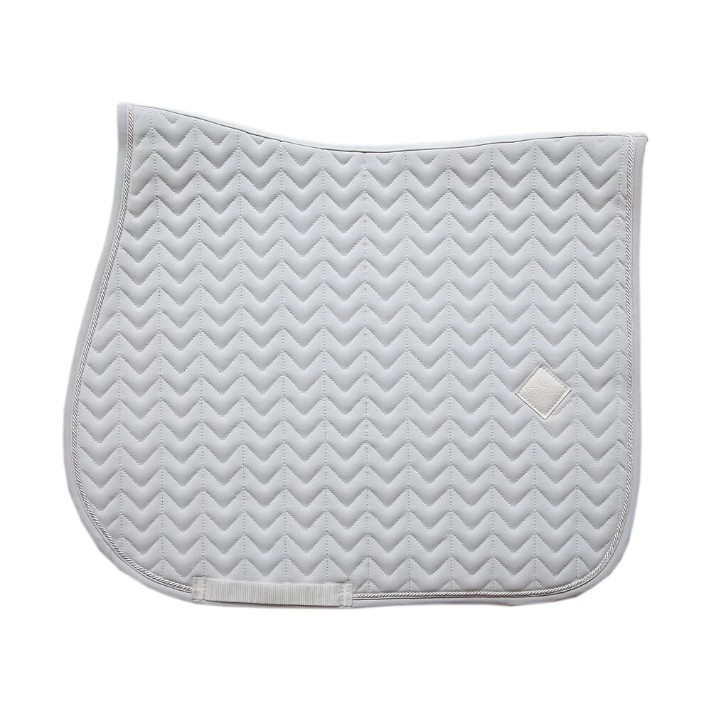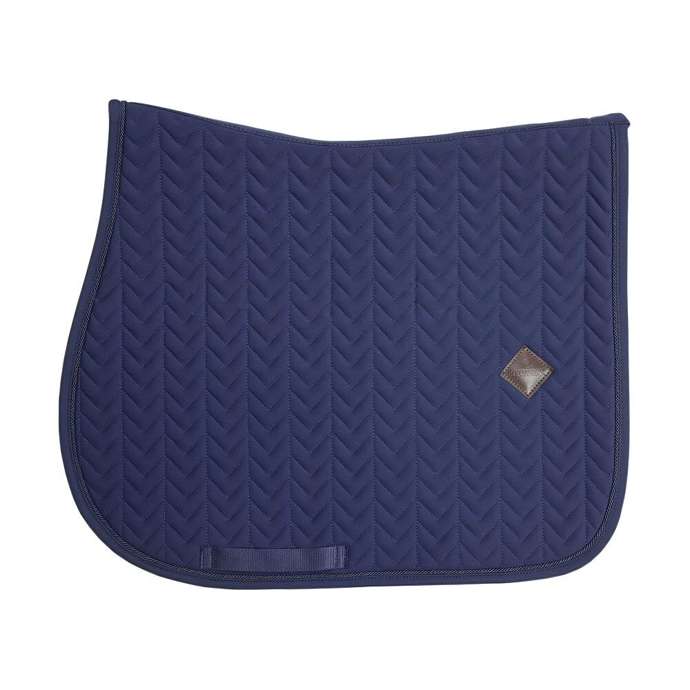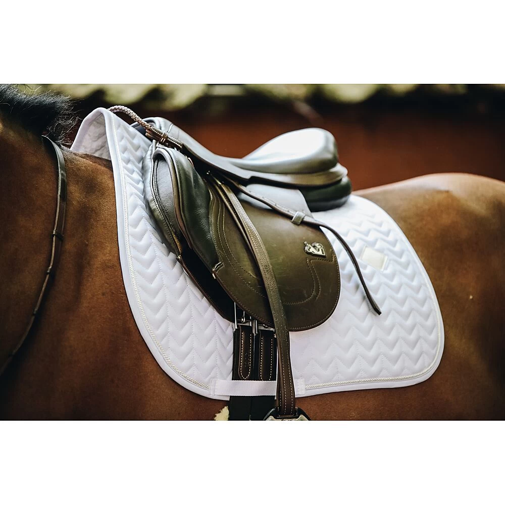 Deze veelzijdige zadeldek Fishbone heeft de ideale vorm voor jumping, zorgt voor een schokabsorberend effect tussen de rug van het paard en het zadel en voorkomt wrijving. Dit dekje heeft het unieke visgraat motief en is gemaakt uit zeer ademend materiaal (43% nylon, 43% polyester en 14% spandex). Dankzij de goede pasvorm is er geen nood aan lus vooraan om het dekje aan het zadel vast te maken, wel een nylon riem voor de singel. Deze Fishbone zadeldek heeft een subtiel lederen logo in dezelfde kleur als het dekje maar tegelijk ook nog voldoende ruimte om te borduren.