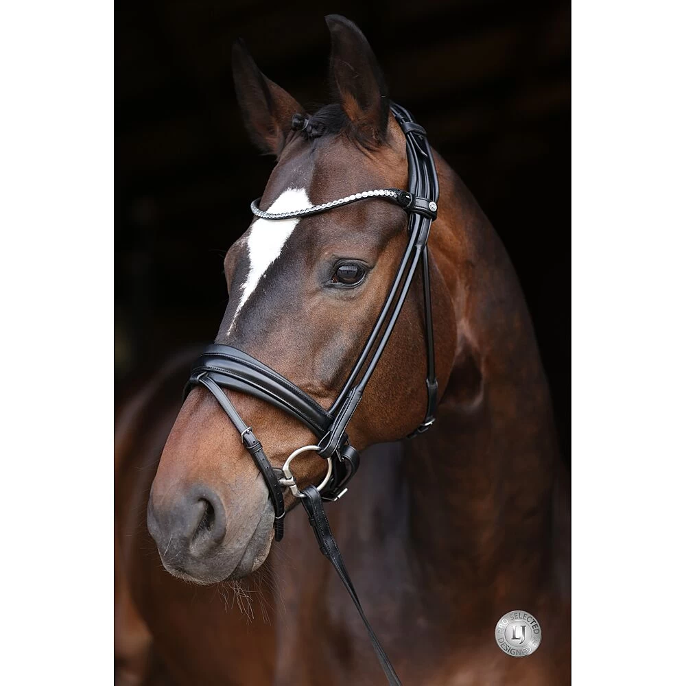 Hoofdstel in rond genaaid Italiaans leder met aansnoerneusriem. Kopriem heeft padding met memory foam. Frontriem is afgewerkt met Stellux kristallen.