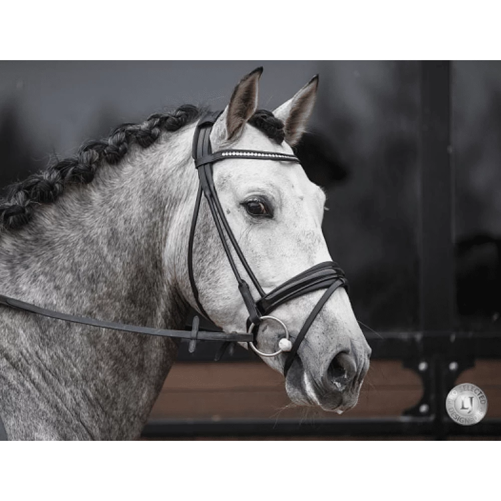 De aansnoerneusriem is afgewerkt met lak leder. De frontriem heeft Stellux kristallen die met hitte bevestigd zijn. Word geleverd met kalfslederen teugels met grip aan binnenzijde. Inox gespenÂ