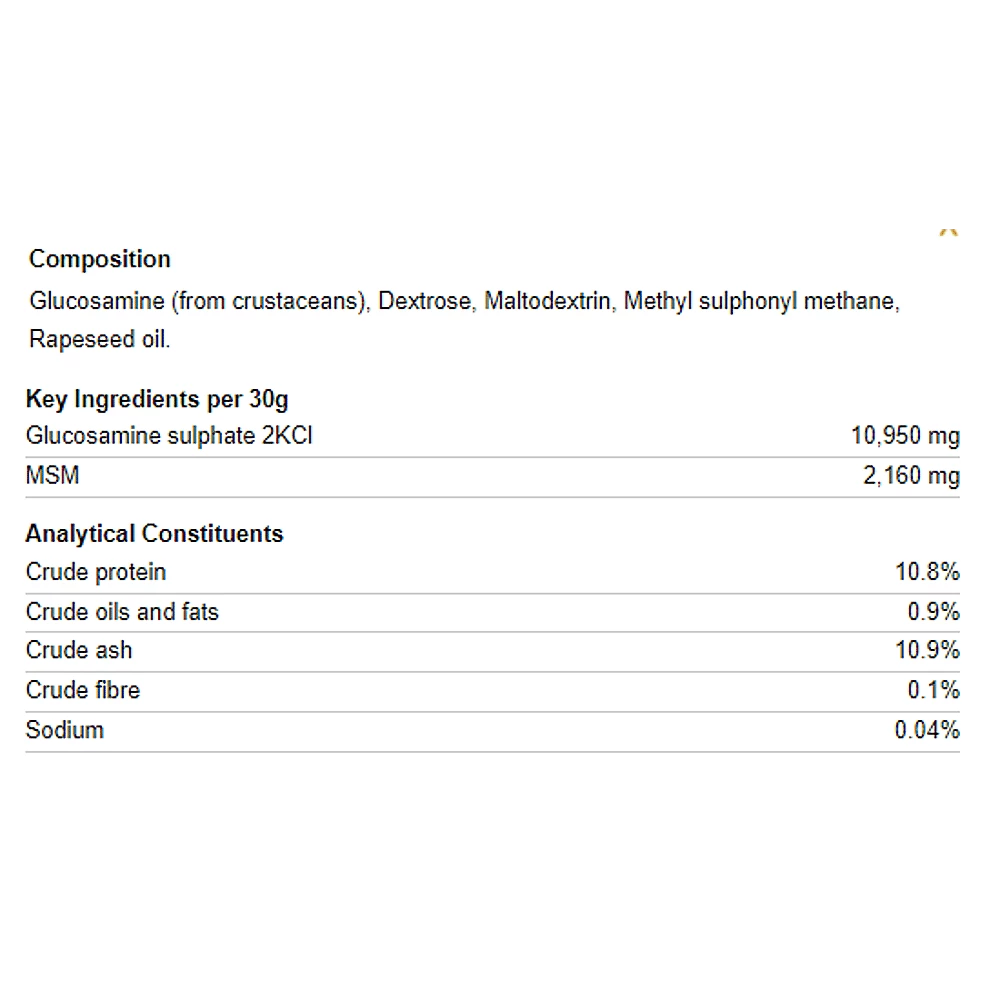 Glucosaminesulfaat 2KCl, Dextrose, Maltodextrine, Methyl sulfonyl methaan (MSM), Koolzaadolie.