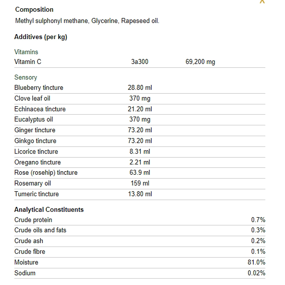 Water, Methyl sulfonyl methaan (MSM), Glycerine, Bosbessen, Gember, Ginkgo, Zoethout, Oregano, Rozemarijn, Kurkuma, Koolzaadolie.
