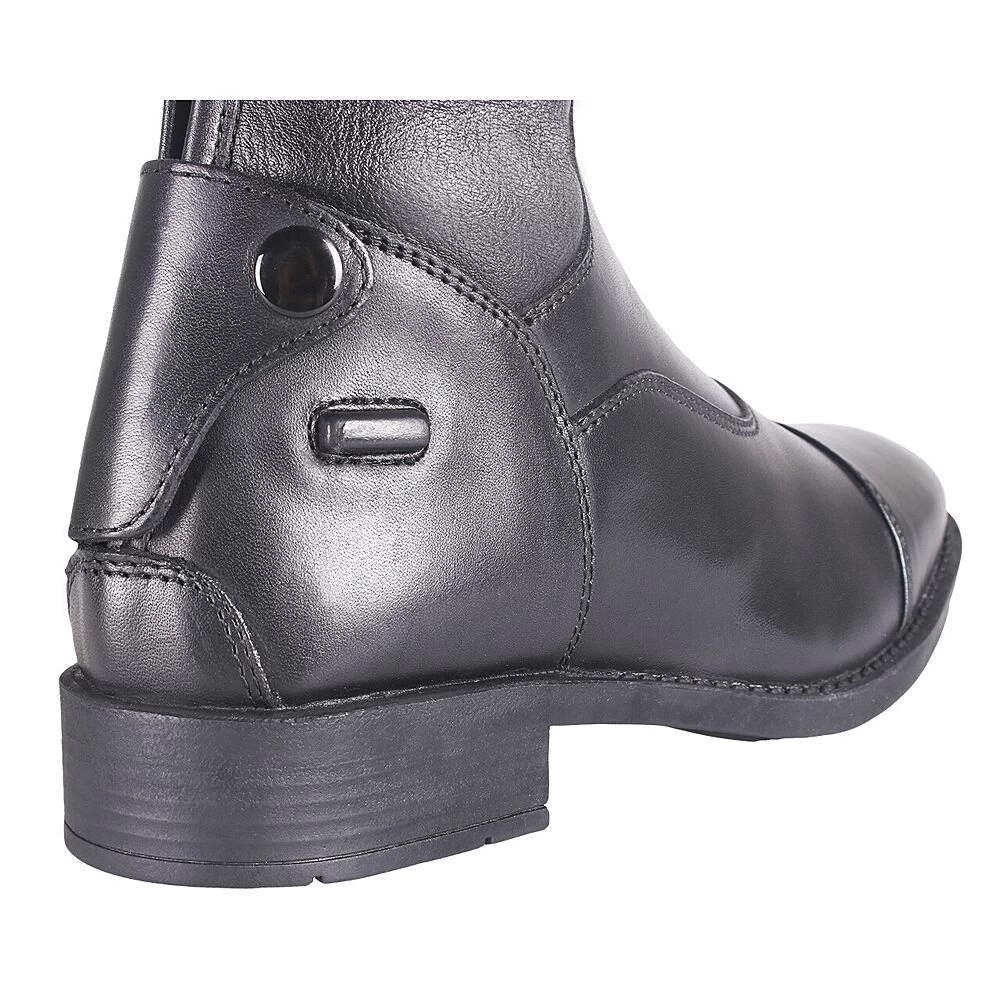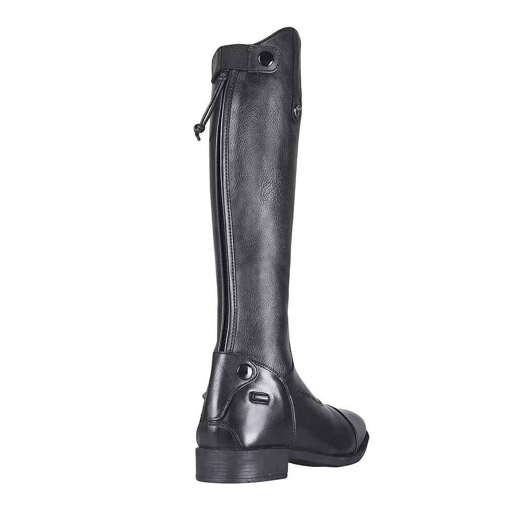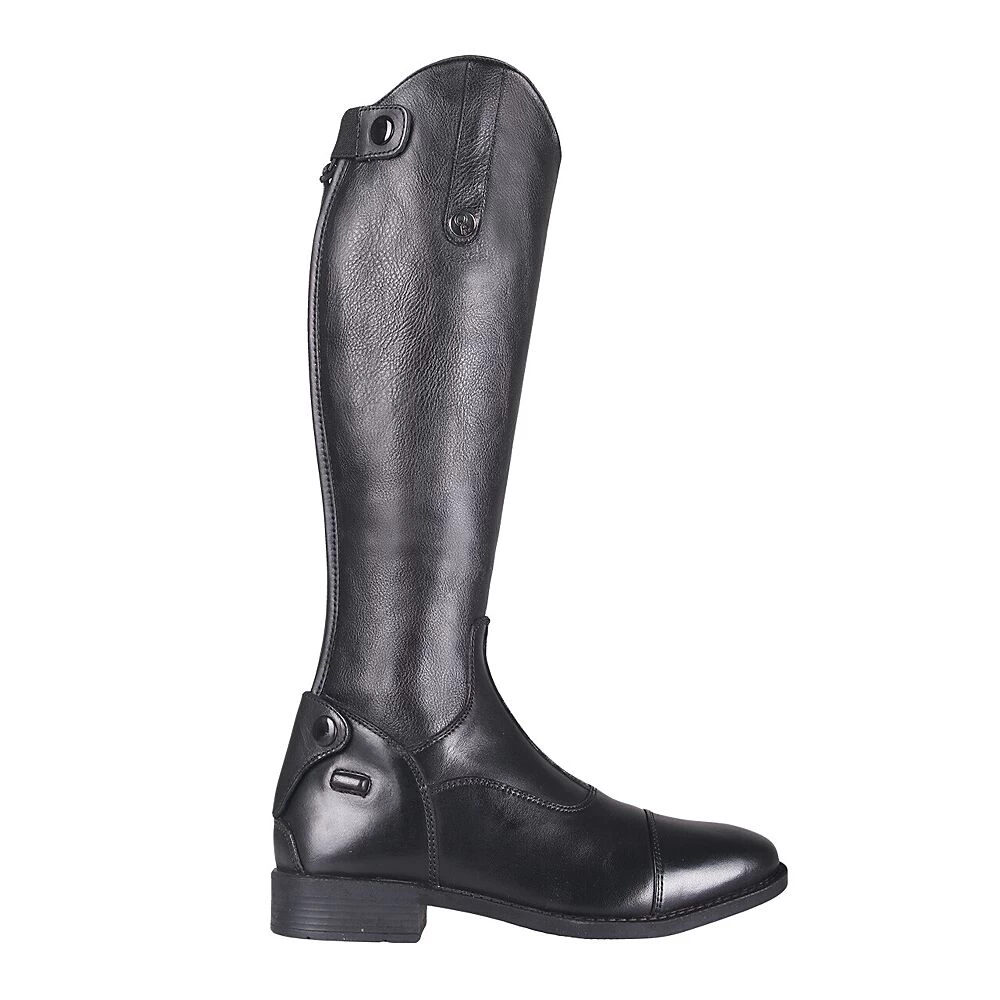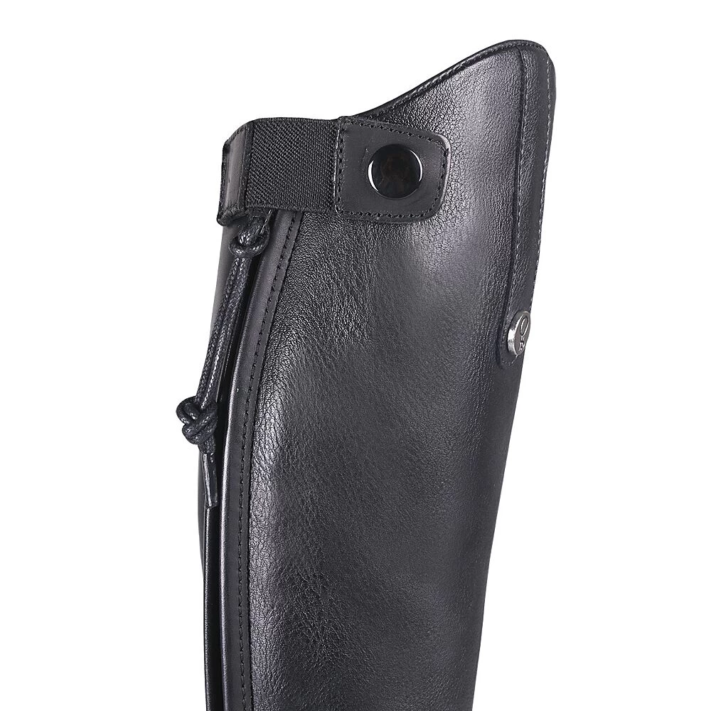 De buitenzijde van de kuit is van elastisch imitatieleer, de binnenkant van de kuit en de voet zijn van echt leer.