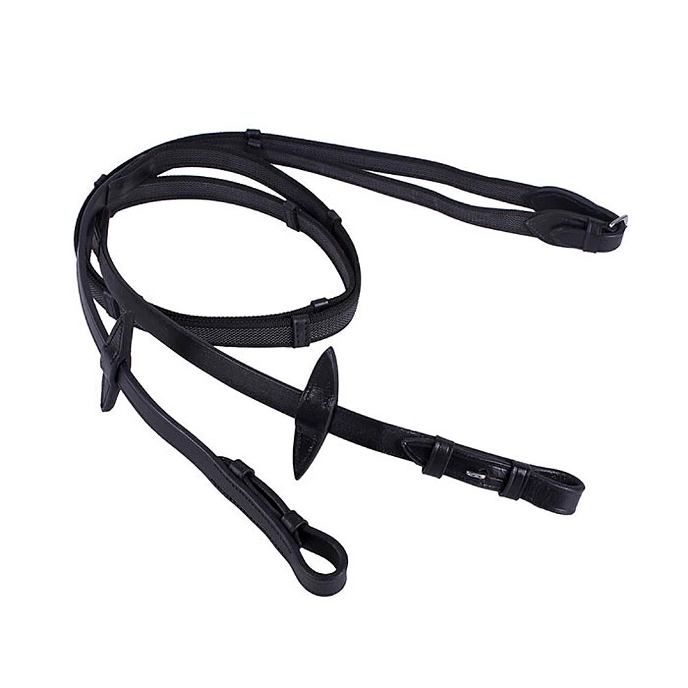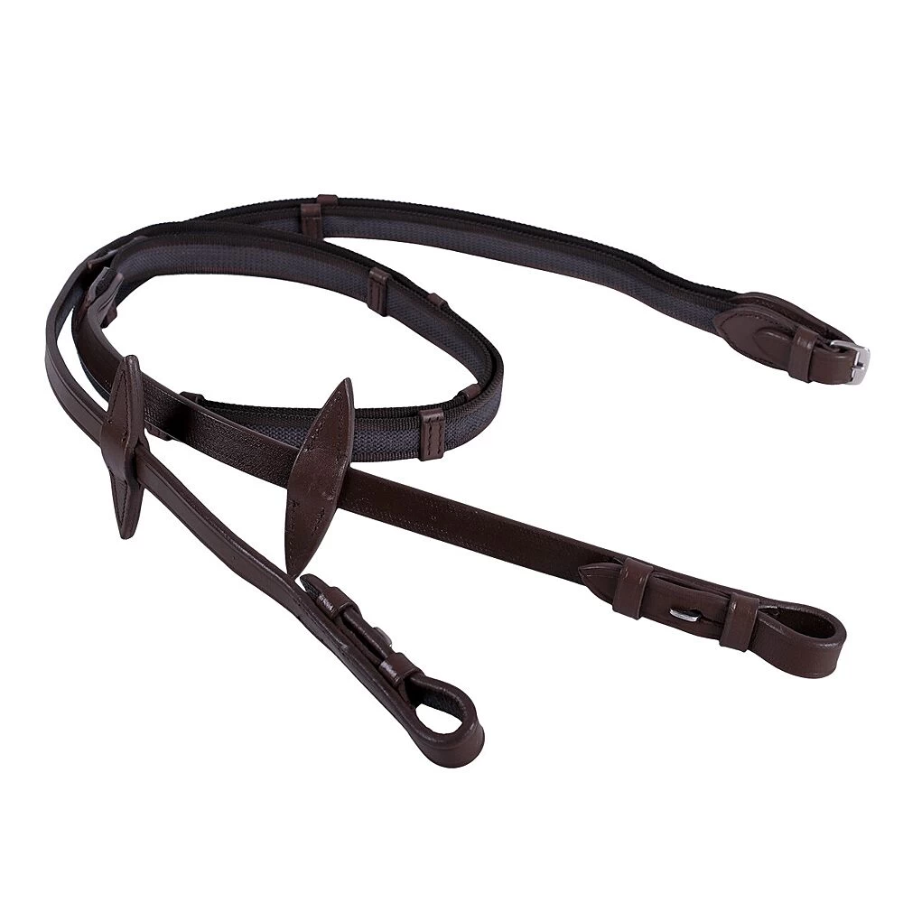 Deze teugels zijn over de hele lengte doorweven met rubber voor een goede grip. Afgewerkt met leren stops en voorzien van martingaalstoppers.