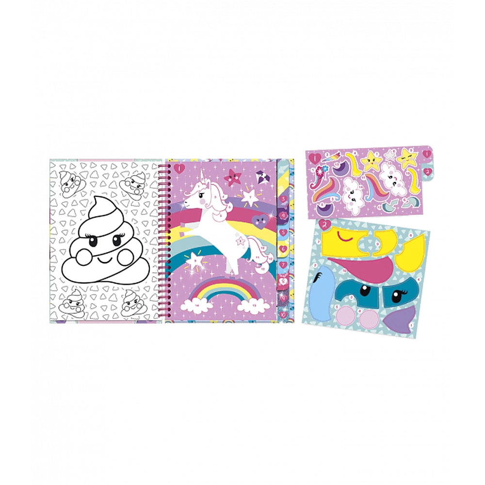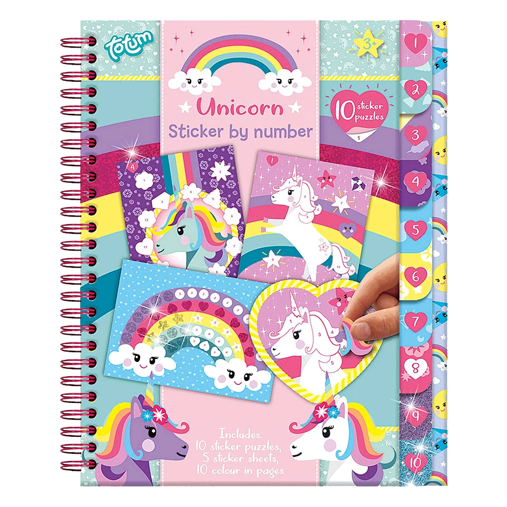 Spiraal gebonden boek, inhoud: 10 stickerpuzzels, stickervellen, 10 eenhoornsjablonen om in te kleuren. Plak gewoon de genummerde stickers op de hiervoor bedoelde stickerpuzzels en kleur de sjablonen naar wens in. Leuk voor kinderen die cijfers, kleuren en vormen leren. Vanaf 3 jaar en ouder.