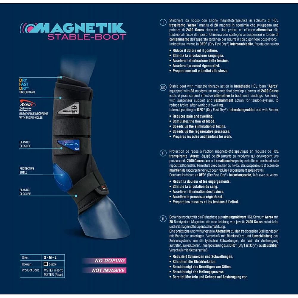 Stalbeschermer van ademend HCL-schuim (AEROX). Een praktisch en efficiënt alternatief voor traditionele bandages. Bevestiging met ondersteuning voor de tussenpees en omsluiting van het pezenstelsel, om zwelling na de training te verminderen. Inwendinge DFD® (Dry Fast Dry®) voering, verwisselbaar, met klittenband.